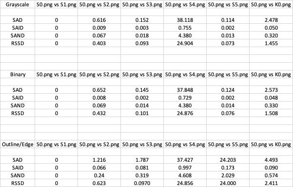 -m ... metric ..... compare difference metric; choices are: sad, said, sand, rssd, all; PURPOSE: To compares two images' shapes using metrics computed from Hu image moments. DESCRIPTION: SHAPECOMPARE compares two images' shapes using metrics computed from Hu Image Moments. Several metrics are available. The image will first be converted to grayscale and can then be converted to binary or an edge outline. The script is designed to work with primarily binary or outline shapes on black backgrounds. However, grayscale shapes on black background or antialiased black/white shapes on black backgrounds should work, also. My analysis (see chart) indicates that outline mode does not work as well as the other two modes. ARGUMENTS: -m metric ... METRIC is the compare metric to compute the difference between the two images. Smaller is better than larger. The choices are: sad (sum absolute difference), said (sum absolute inverse difference), sand (sum absolute normalized difference), rssd (root sum squared difference) or all (report all of them). The default=sad.